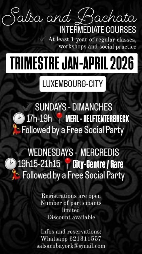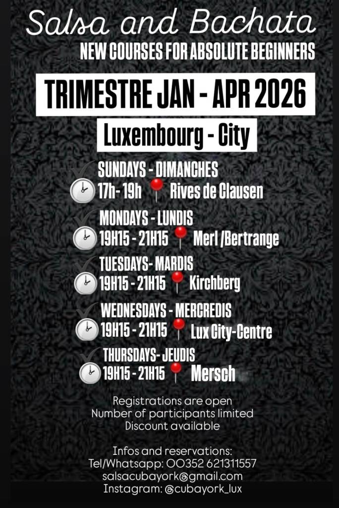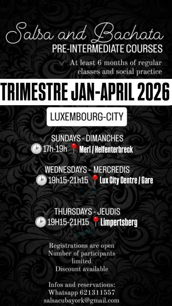 Voici les horaires prévus pour le trimestre janvier jusqu’à avril 2026 pour les cours de niveaux débutants, improvers, pre-inter et inter/avancés. Pour le détails (professeurs etc.), vous retrouverez les infos sur les flyers spécifiques publiés au fur et à mesure ici et sur nos réseaux sociaux. N’hésitez pas à revenir consulter ici ou abonnez-vous à nos réseaux sociaux (Instagram: cubayork_lux, facebook page: CubaYork Dance School Luxembourg) pour les éventuels ajouts/updates.