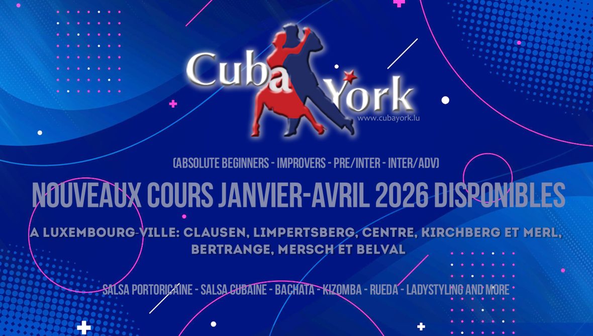 Voici les horaires prévus pour le trimestre janvier jusqu’à avril 2026 pour les cours de niveaux débutants, improvers, pre-inter et inter/avancés. Pour le détails (professeurs etc.), vous retrouverez les infos sur les flyers spécifiques publiés au fur et à mesure ici et sur nos réseaux sociaux. N’hésitez pas à revenir consulter ici ou abonnez-vous à nos réseaux sociaux (Instagram: cubayork_lux, facebook page: CubaYork Dance School Luxembourg) pour les éventuels ajouts/updates.